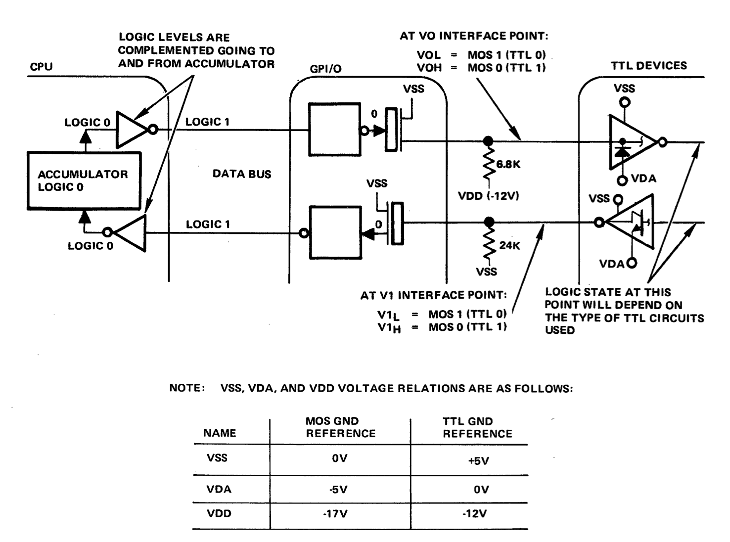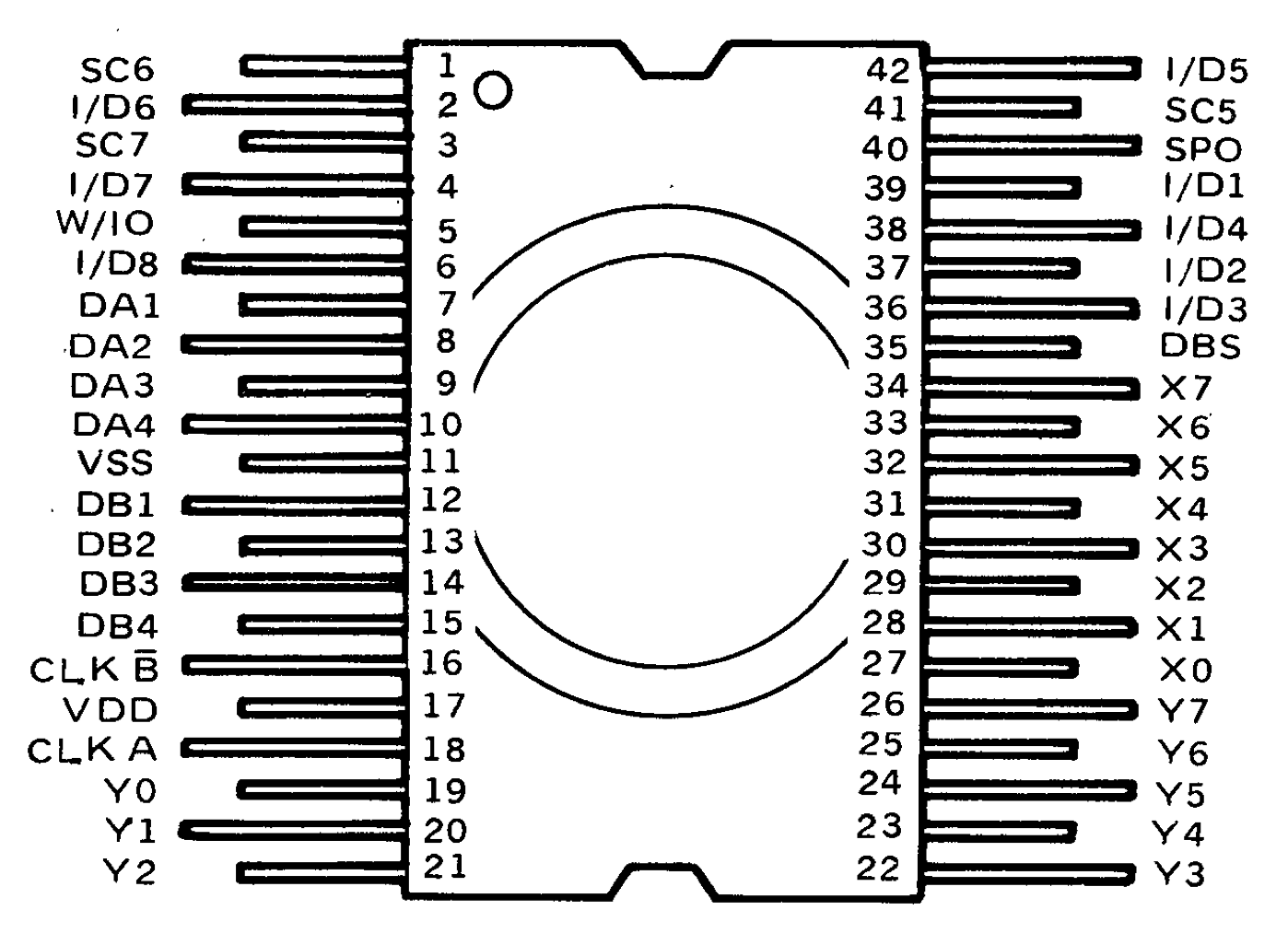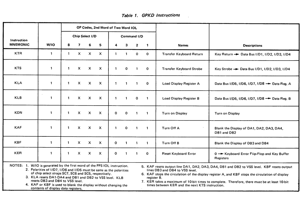 Chip selection of these circuits is possible by the use of 3 chip address straps that can be terminated, by the user, to create each chip address. The GPKD is then selected when SC5, SC6, SC7 = I/D5, I/D6, I/D7 and I/D8 = 1b. The GPKD is accessed with an I/O enable signal from the CPU and a simultaneous 8-bit instruction from ROM. 4 bits of the instruction are used to address the particular GPKD chip (I/D5..8 is the device ID); the other 4 bits define the I/O operation (I/D1..4 is the command).