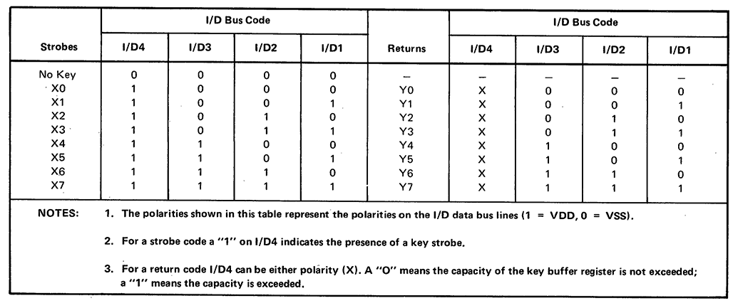 When a key press is detected, its code (#strobe, #return) is added to the internal buffer of the 10788. The CPU has access to this buffer by sending a KTS command. The bit 3 of the returned code will determine if there is a key pressed available from the buffer. If yes, then a KTR command will give the second part of the key code, and unstack the key from the buffer. In the end, you have the key codes of the strobe and return that were detected for this key press. Besides, this encoding explains why the 10788 only handles one key stroke at a time (because otherwise, one cannot send multi codes to the CPU in only one set of 2x4-bit).