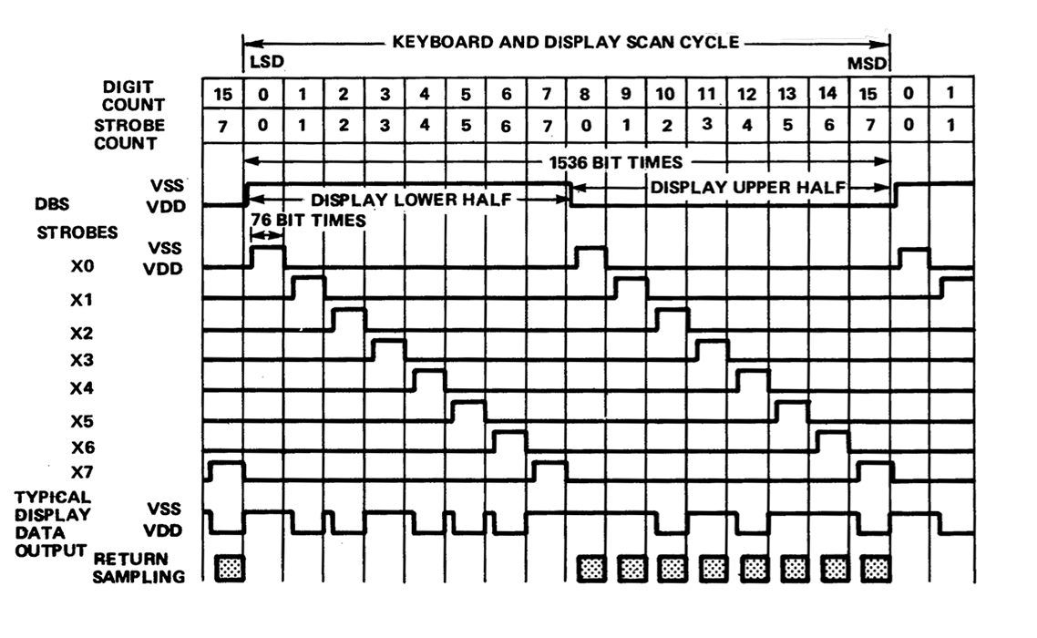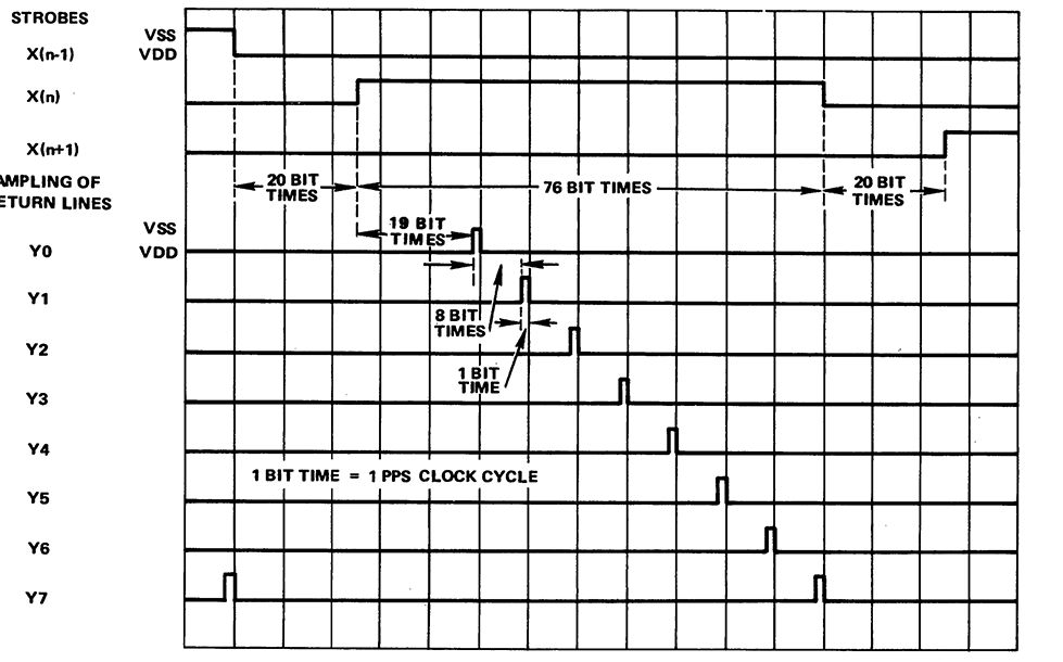 The 10788 provides 8 strobe lines (X) and 8 return lines (Y) to manage a matrix of 64 keys. The datasheet explains with many words how this switch matrix works. Actually, it is very simple and can be summed even more easily: If only one key is pressed during a scan cycle, this key is stored in a 9-key buffer. if many keys are depressed at the same time (during a scan cycle) all the events are simply ignored. The duration of a scan cycle is: 8 strobesx96 bit time x 2 = 1536 bit time, which is about 7,68ms. The x2 comes from the fact that X strobes are sequentially activated from 0 to 7 with DBS=0, then again with DBS=1. DBS is used for the display mux. The key scan is actually performed during DBS=1. One can see that by looking at the last line of the figure below “Return sampling”: