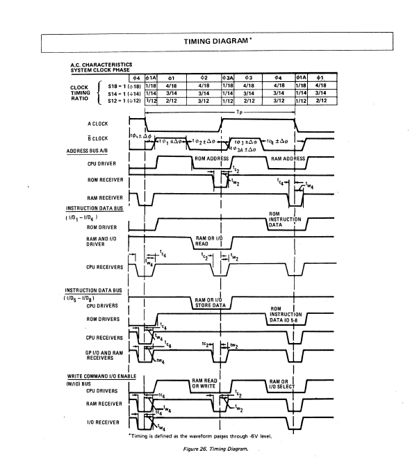The I/O section is triggered by the execution of an IOL instruction in the uP which causes the WI/O line to signal all I/O devices in the system that the next instruction byte contains a device identification (4-bit) and the specific command to be executed (4-bit). The IOL instruction, via the WI/O line, also tells the RAM to stay off the data bus so that the input/output data may be transmitted.